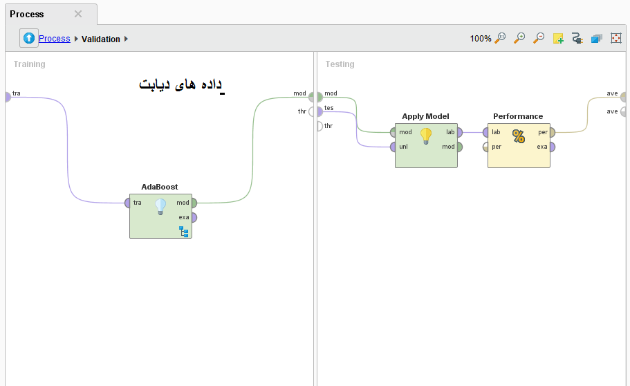 بنابراین در این بخش داده های Train با الگوریتم آدابوست(adaboost) اعمال شده و مدل مربوطه تولید میگردد. در بخش بعد که بنام Test است، میبایست داده های آزمایشی یا Test که 20% از داده ها است به کنترل apply model وارد شود. این کنترل دو ورودی و یک خروجی دارد. به یکی از ورودی های این کنترل داده های تست و به یکی از ورودی های دیگر نیز خروجی الگوریتم آدابوست(adaboost) وارد میشود. از مهمترین کاربرد این کنترل این است که داده های جدید را طبقه بندی یا پیش بینی می کند.