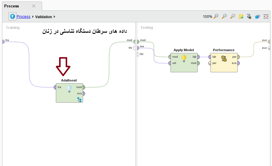 این پروژه با استفاده از نرم افزار داده کاوی رپیدماینر تهیه شده است. هدف اصلی این پروژه انجام فرایند طبقه بندی یا پیش بینی سرطان دستگاه تناسلی در زنان با استفاده از الگوریتم یادگیری ماشین یا طبقه بندی آدابوست(adaboost) در نرم افزار داده کاوی رپیدماینر است. در این پروژه از برخی از مهمترین کنترل ها و امکانات داده کاوی جهت طبقه بندی یا پیش بینی سرطان دستگاه تناسلی در زنان مربوط به ابزار داده کاوی رپیدماینر استفاده شده است که تنها با کمی بررسی عمقی میتوان سایر روش ها را پیاده سازی نمود. بنابراین پروژه فوق میتواند بعنوان یک الگوی منطقی و قابل قبول جهت یادگیری و ارائه پروژه های درسی استفاده گردد.