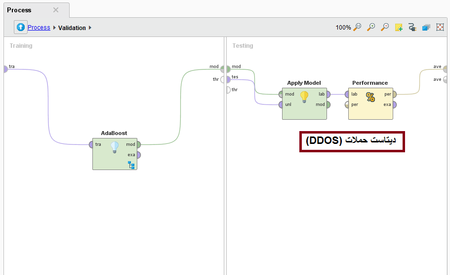 پس از اینکه داده ها پیش پردازش شدند و مقادیر پرت از دیتاست اصلی نیز حذف شد، کافیست الگوریتم اصلی شبیه سازی شود. به منظور شبیه سازی الگوریتم های یادگیری ماشین و بخصوص الگوریتم های آدابوست(adaboost) میبایست از کنترل Validation در نرم افزار داده کاوی رپیدماینر استفاده گردد. این کنترل بسیار مهم است و برای شبیه سازی الگوریتم های یاد گیری ماشین و ارزیابی نتایج استفاده میگردد بدین منظور در شبیه سازی انجام شده از منوی جستجو کافیست کلمه Validation را تایپ کرده و کنترلی به نام Bootstrapping-validation را به صفحهprocess اضافه نمود. بنابراین پس از اضافه کردن این کنترل به صفحه میبایست خروجی کنترل Replace Miss Value به ورودی این کنترل وارد شود. سپس دو خروجی از خروجی های کنترل Bootstrapping-validation بنام Avg, mod را به خروجی Process متصل میکنیم.