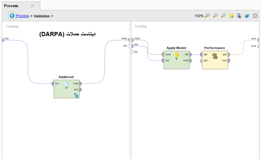 این پروژه با استفاده از نرم افزار داده کاوی رپیدماینر تهیه شده است. هدف اصلی این پروژه انجام فرایند طبقه بندی یا پیش بینی دیتاست حملات (DARPA) با استفاده از الگوریتم یادگیری ماشین یا طبقه بندی آدابوست(adaboost) در نرم افزار داده کاوی رپیدماینر است. در این پروژه از برخی از مهمترین کنترل ها و امکانات داده کاوی جهت طبقه بندی یا پیش بینی دیتاست حملات (DARPA) مربوط به ابزار داده کاوی رپیدماینر استفاده شده است که تنها با کمی بررسی عمقی میتوان سایر روش ها را پیاده سازی نمود. بنابراین پروژه فوق میتواند بعنوان یک الگوی منطقی و قابل قبول جهت یادگیری و ارائه پروژه های درسی استفاده گردد.